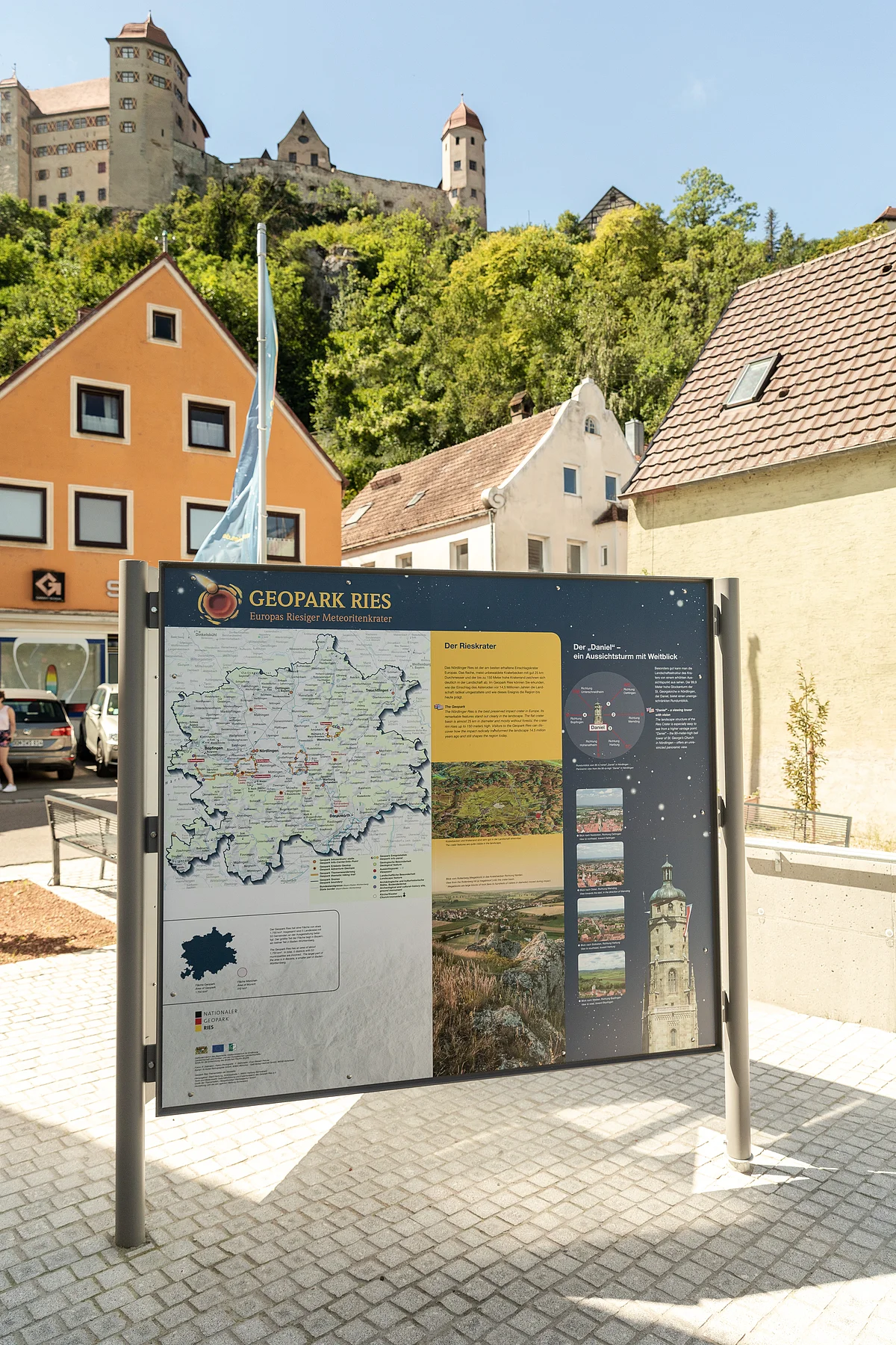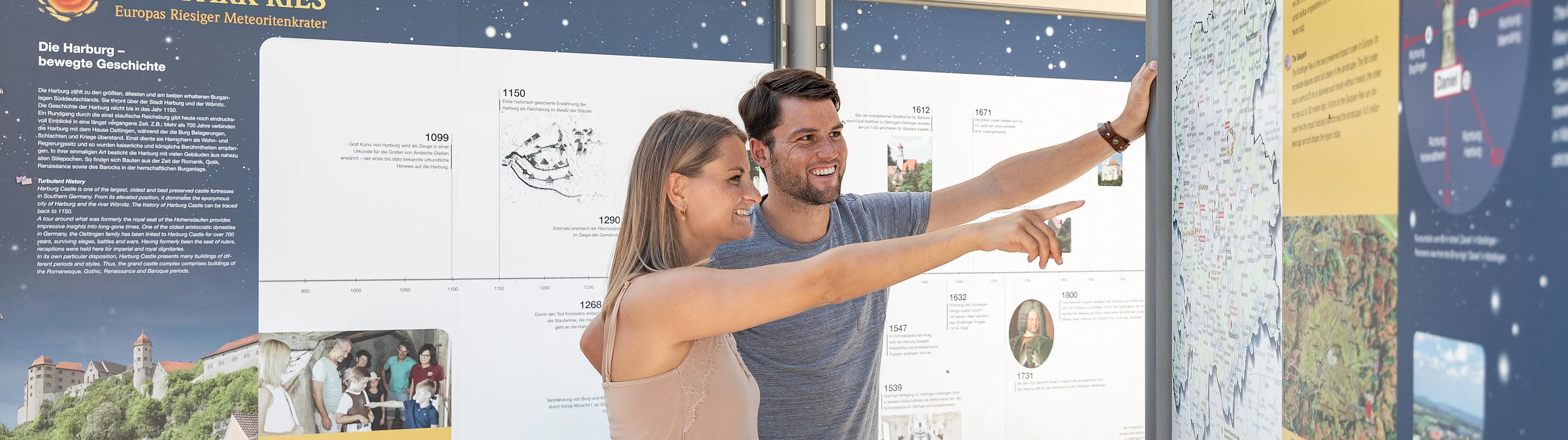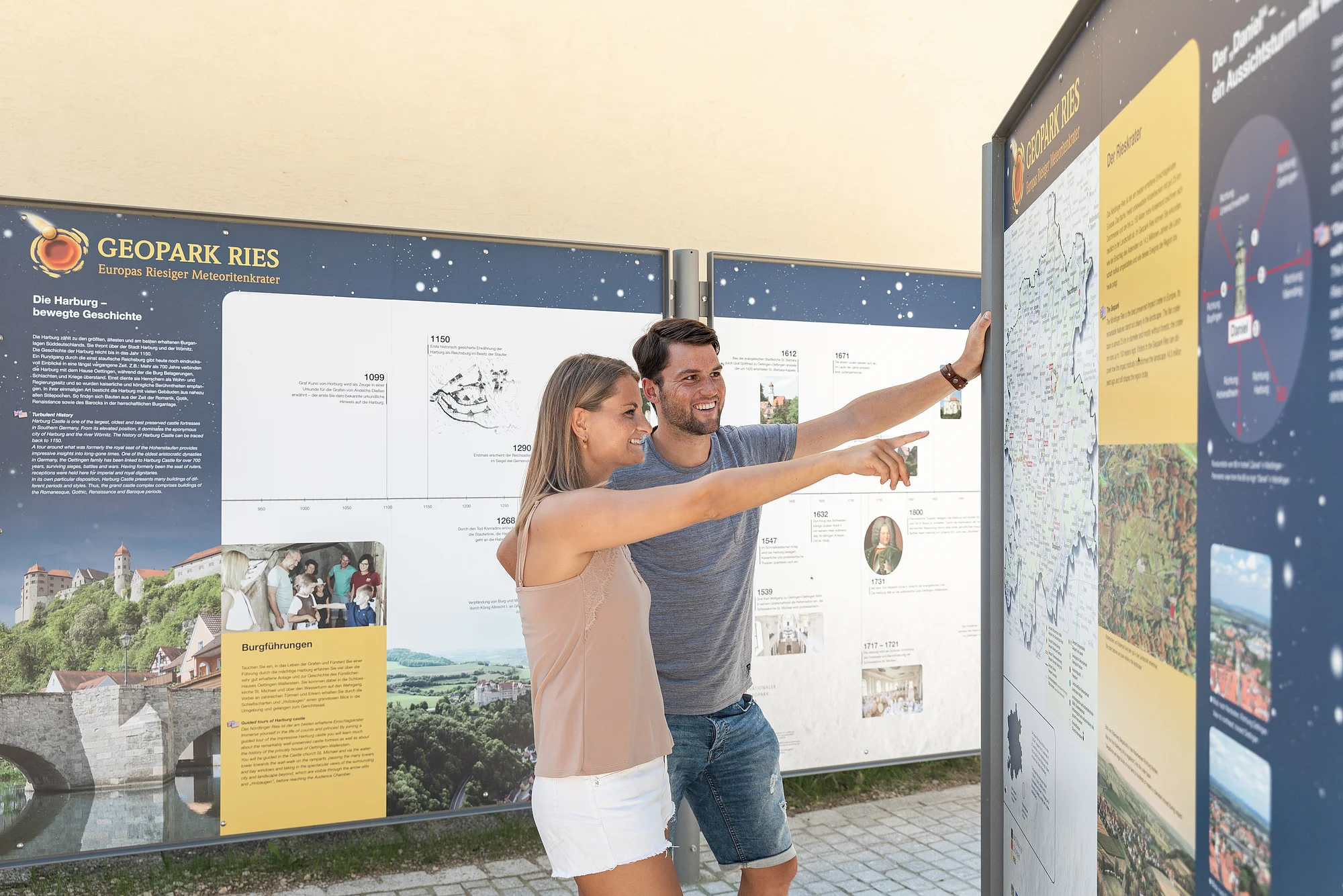 Die Infostelle Harburg gibt nicht nur Auskunft über die Entstehung des Rieskraters, dessen Geologie und seiner Besonderheiten, sondern auch über die Verbindung des UNESCO Global Geoparks Ries zu Raummissionen der ESA und NASA. Aber auch Stadtgeschichte und Sehenswürdigkeiten der Stadt Harburg sowie interessante Informationen zur ortsansässigen Firma Märker bereichern die Tafeln der Geopark Infostelle.