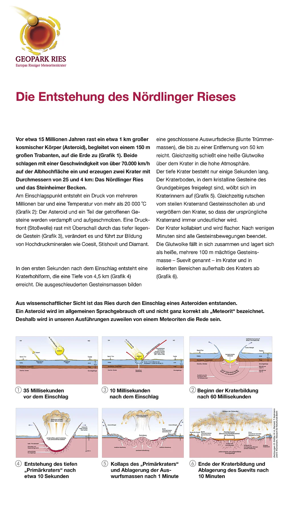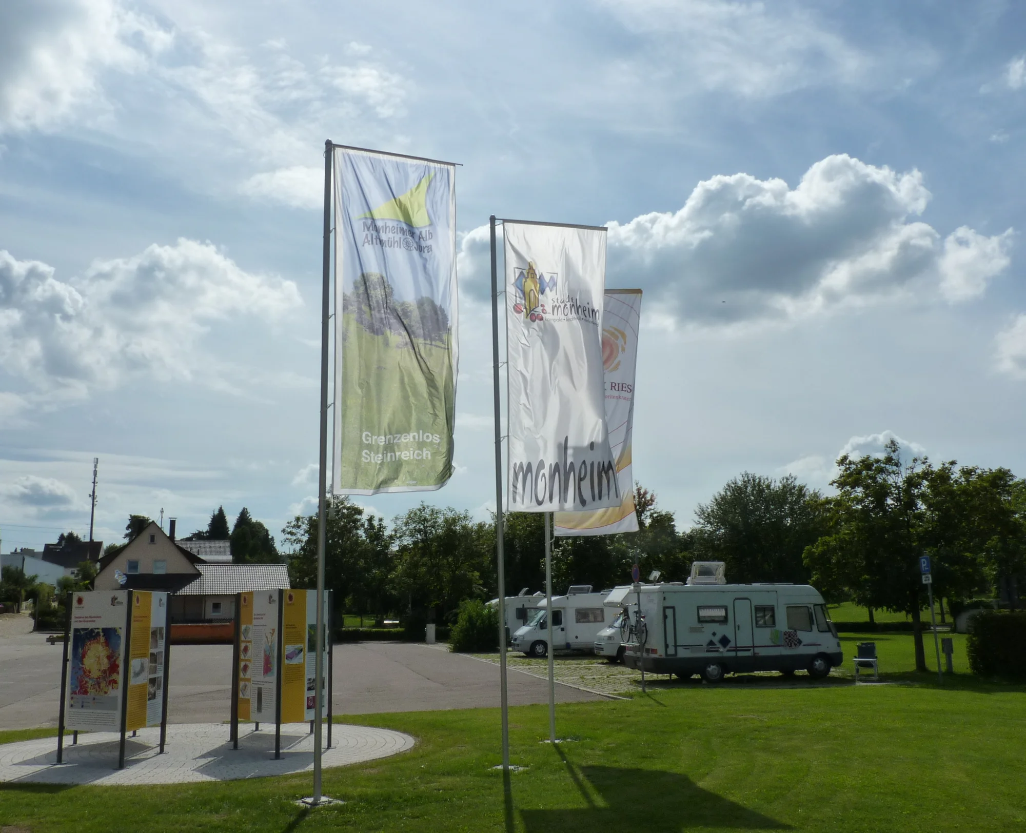 Mehrere Schautafeln stellen einen interessanten Erstkontakt zum UNESCO Global Geopark Ries her und verschaffen Besuchern und Besucherinnen einen Überblick, von welchen Standorten aus Besucher die Kraterstruktur im Gelände besonders gut erkennen können. Daneben überrascht die Geopark Infostelle Monheim mit einer Vielzahl „lokaler“ Themen: Das im nahe gelegenen Steinbruch Otting untersuchte Suevitgestein verwandelte den Vulkankrater Nördlinger Ries quasi „über Nacht“ zum Meteoritenkrater. Schautafeln zeugen von den Karstformen der Monheimer Alb, dem südlichsten Ausläufer der Frankenalb. Die Auswirkungen des Riesereignisses auf die Monheimer Alb und die spannende Landschaftsgeschichte um das verschüttete Tal des Urmains bei Monheim runden das Wissens-Spektrum der Monheimer Geopark Infostelle ab.
