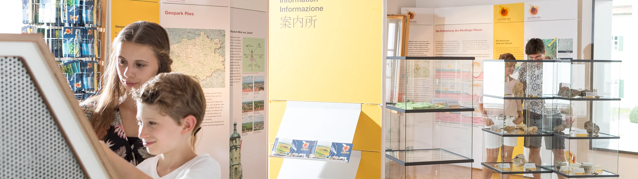 Bebilderte Infotafeln vermitteln alles Wissenswerte über Nationale und über UNESCO-Geoparks in Deutschland, über den UNESCO Global Geopark Ries sowie über die besonderen Gesteine des Einschlagskraters. Das Infozentrum in Nördlingen gibt einen kompakten Überblick über die Archäologie und Besiedlungsgeschichte der Region. Der spannende Zusammenhang zwischen Geologie und Architektur wird anhand von ausgewählten Bauwerken aufgezeigt. Wie das kosmische Ereignis die heimische Wirtschaft und Landschaft bis heute bestimmt und welch hohen Stellenwert die Impaktforschung im Rieskrater hat, sind weitere Themen im Nördlinger Geopark Infozentrum.