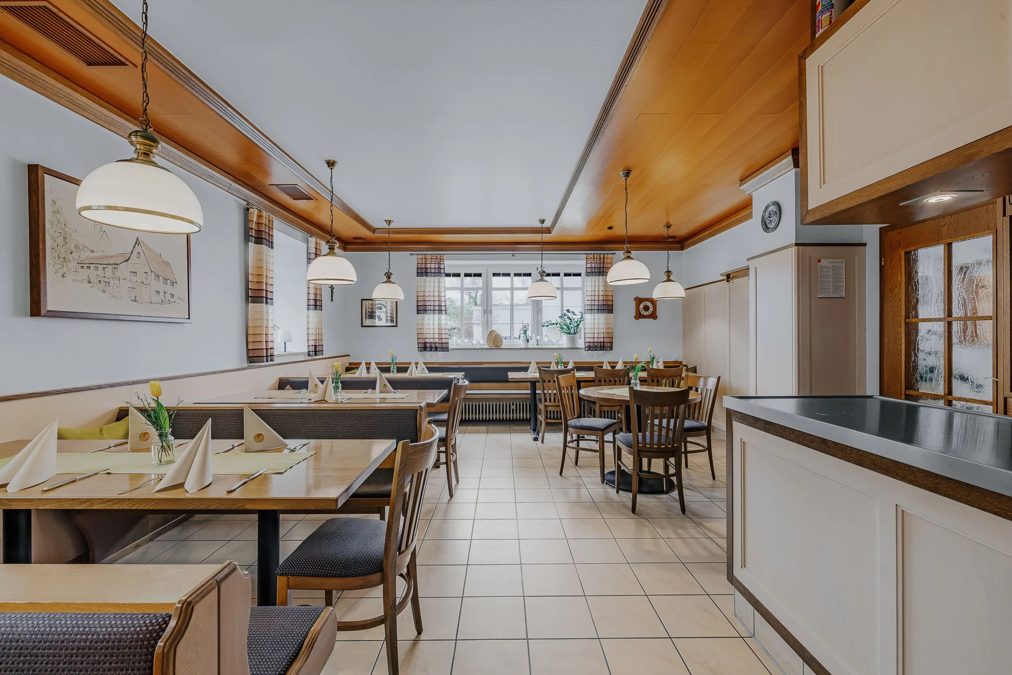 Blick auf die helle Gaststube im Landgasthof Adler mit gedeckten Tischen.