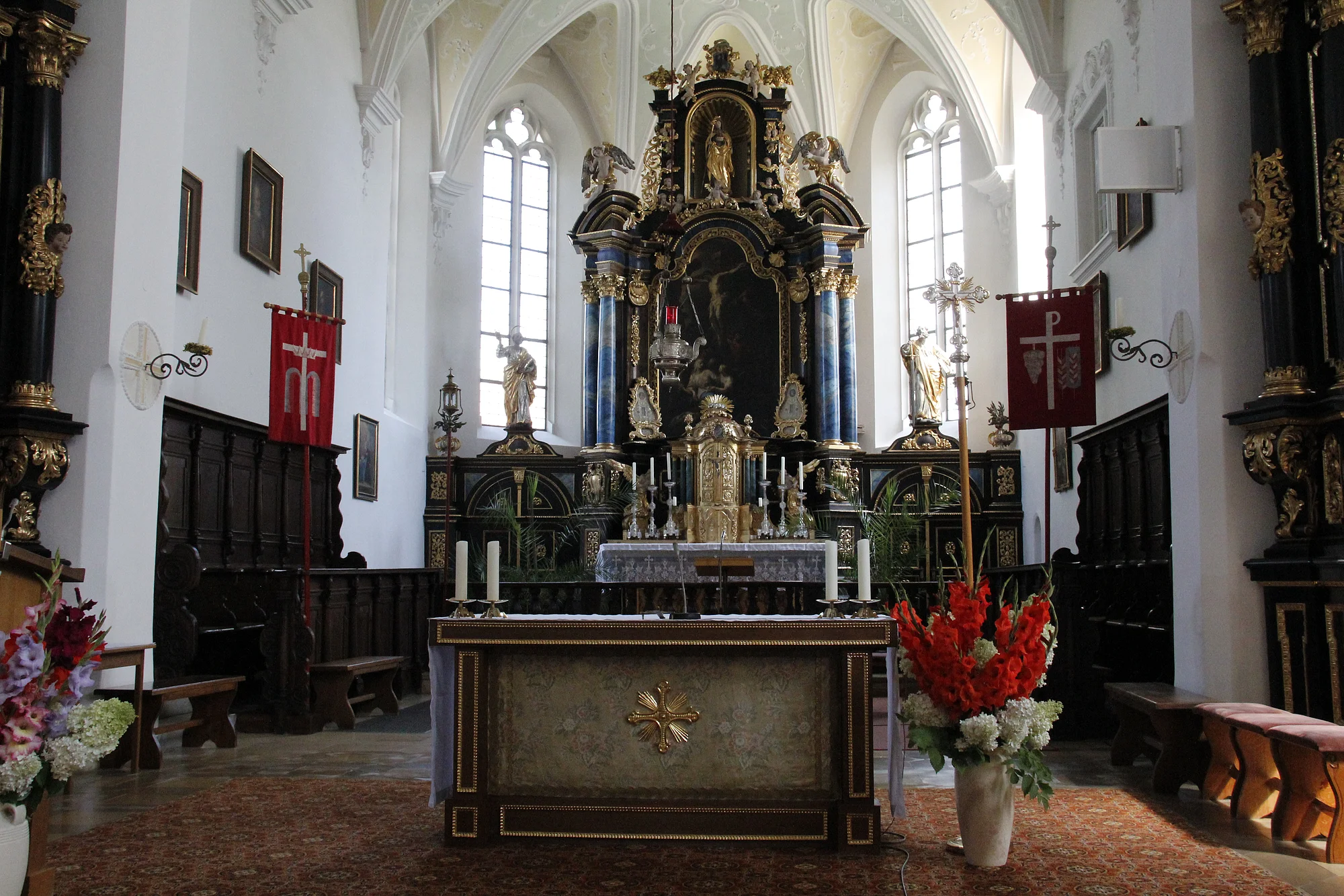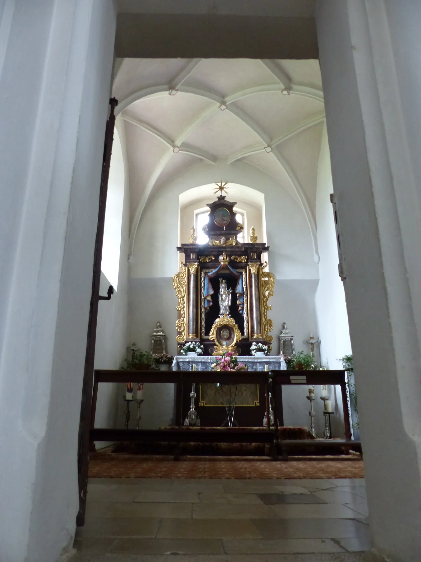 Die Walburgakapelle in der Kirche ist unter einem spätgotischen Netzrippengewölbe aus dem 16. Jahrhundert zu bewundern. Der Altar der Kapelle birgt einen kostbaren Schatz: Die 65 cm hohe Statuette der Heiligen Walburga, die gegen 1700 vom Augsburger Goldschmied Michael Hueter aus Silberblech getrieben wurde. Davor ein weiteres Reliquiar mit einer damals von Eichstätt nach Monheim überführten Walburgisreliquie.