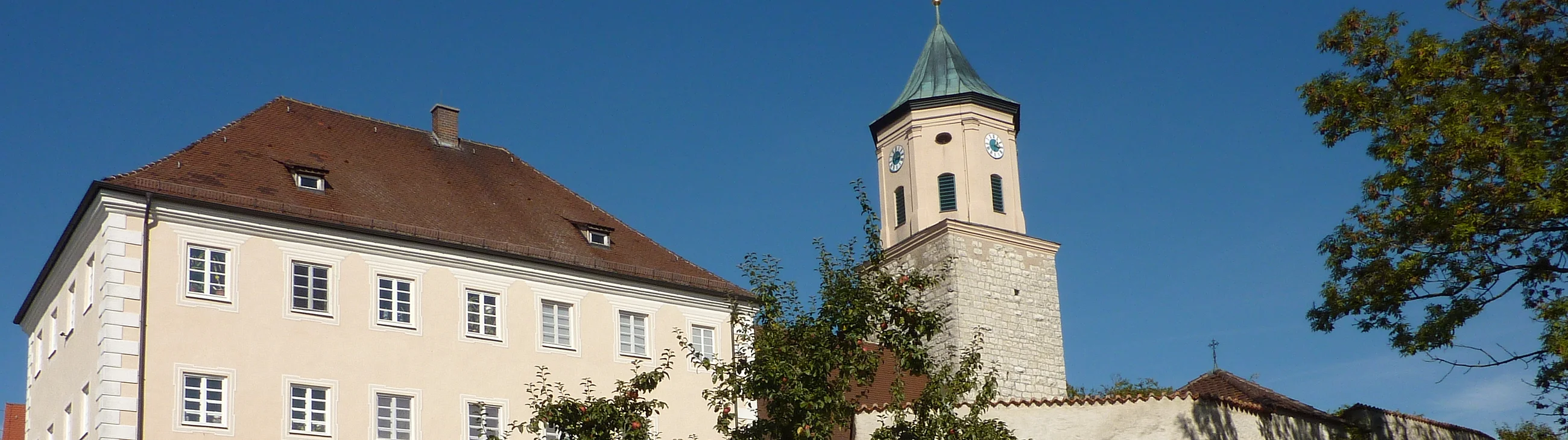 Kirche und Schloss mit einer umlaufenden Mauer, stehen auf einem alten Burgstall, der von einem Wassergraben umgeben war. Erhalten blieb von der alten Burg außer Mauer und Graben der romanische Unterbau des Bergfrieds, auf den der Kirchturm aufgesetzt ist.