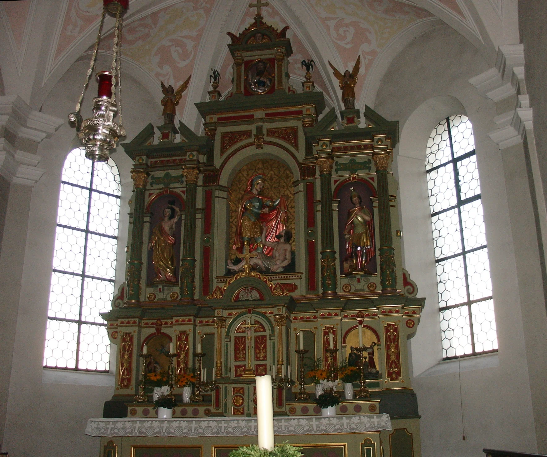 Nach Abbruch des alten Langhauses 1737 wurde das jetzige neu erbaut und die Kirche 1743 geweiht. Gegenüber der Kanzel befindet sich ein Kruzifix aus der Mitte des 18. Jh. Am Westgiebel ist das Wappen des Abtes Rogerius Friesl aus Kaisheim zu sehen. Um die Pfarrkirche ist ein Friedhof angelegt.