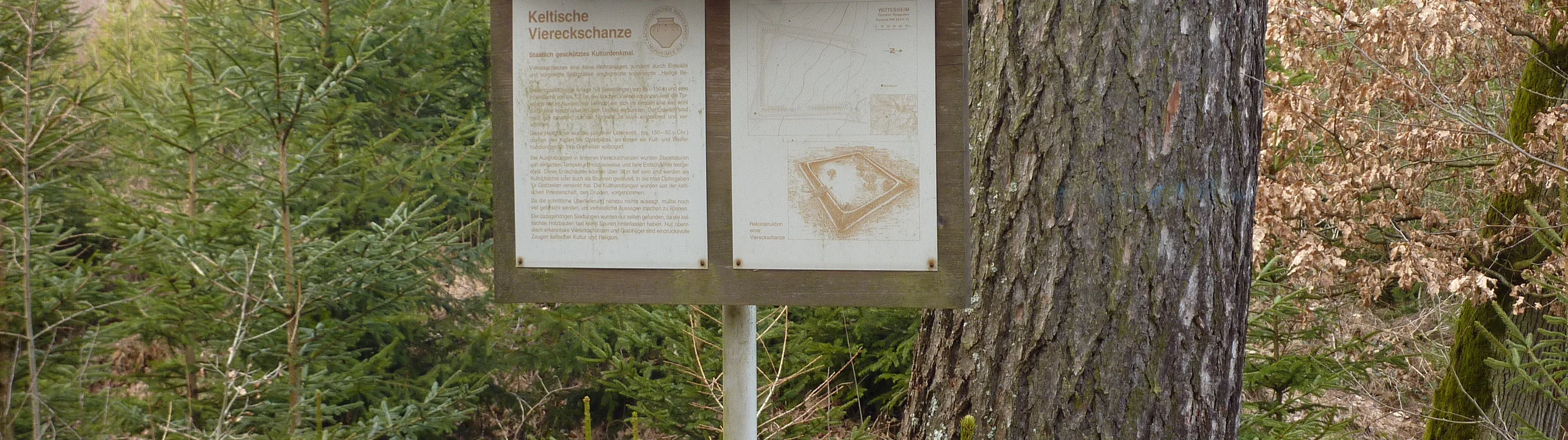 Diese trapezförmige Anlage auf sem 3. - 1. Jh. v. Chr. hat Seitenlängen von 95 - 150 m und eine Innenfläche von ca. 1,2 ha. Bei solchen Viereckschanzen liegt die Toranlage nie im Norden; hier befindet sie sich im Westen und war wohl durch eine Holzbrücke mit dem Umfeld verbunden. Die Erdwälle sind noch gut erhalten, nur der Nordwall ist stark eingeebnet und verschliffen.