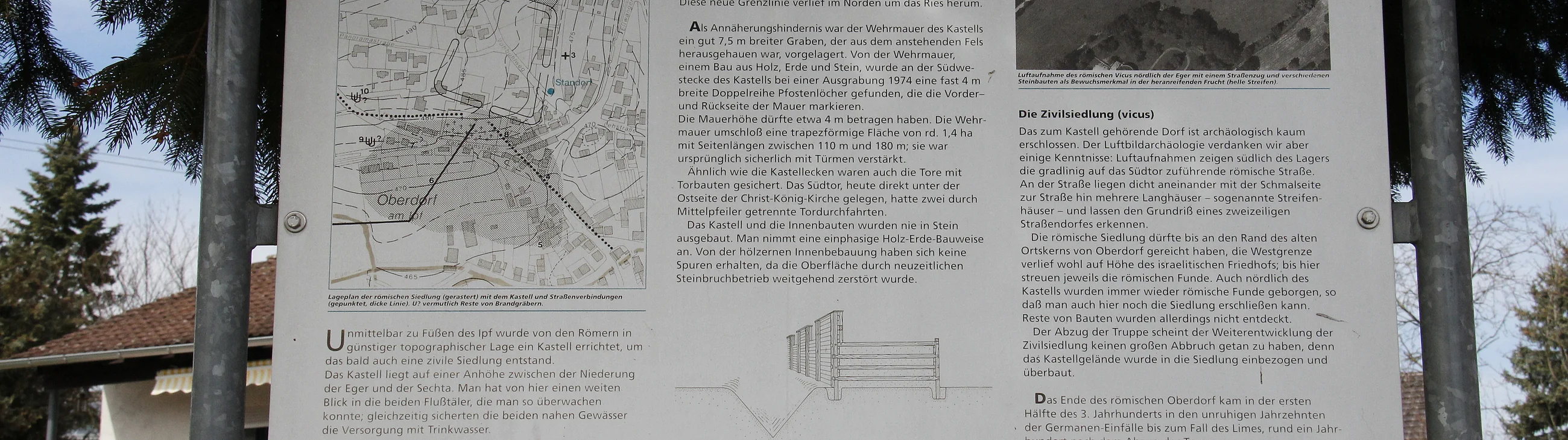 Das Kastell Oberdorf lag am nordwestlichen Rand von Oberndorf, und zwar nördlich von der Christ-König-Kirche, die über dem Südgraben steht. Die Umwehrung des Holzkastells, das nie in Stein ausgebaut worden ist, umfasste eine Innenfläche von 1,7 ha, so dass man als Besatzung eine 500 Mann starke Auxiliarkohorte annehmen kann. Der Name der Kohorte ist jedoch unbekannt. Das Kastell wurde gleich bei der Okkupation des Landes durch die Römer unter Kaiser Domitian am Ende des 1. Jhs. n. Chr. erbaut und ist schon am Anfang des 2. Jhs. wieder aufgegeben worden, sicherlich im Zusammenhang mit dem Aufbau des raetischen Limes. An seiner Stelle hat aber ein kleiner Vicus fortbestanden. Die Lage des Kastells wurde durch einen Knotenpunkt im römischen Strassensystem bestimmt. Hier trafen die Strassen zusammen, die von Heidenheim und Faimingen im Süden einerseits und von Munningen im Osten andererseits kamen. Der römische Name des Kastells und des späteren Vicus ist auf der Tabula Peutingeriana überliefert; er lautete Opia.