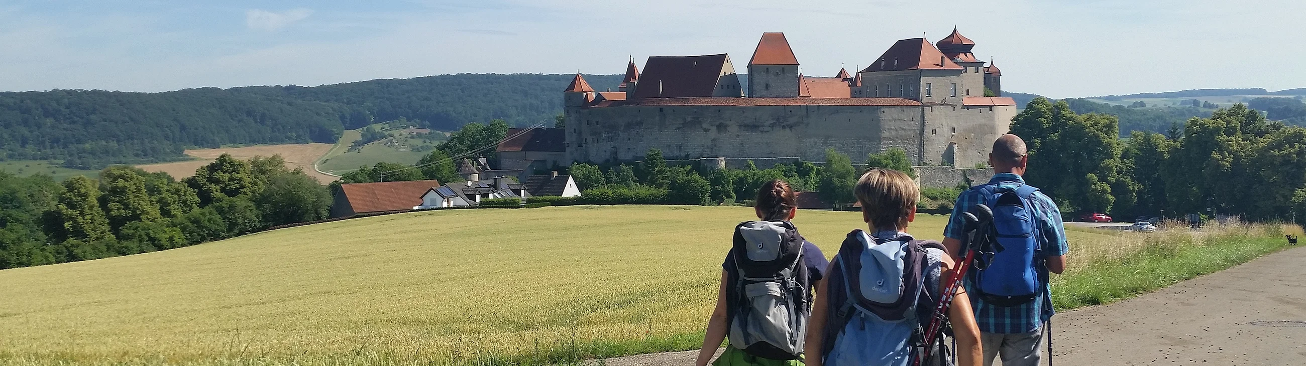 Nach dem „Abstieg“ vom Bock gelangen wir durch den Wald nach Eisbrunn. Im an die Waldschenke anschließenden Garten können zahlreiche exotische Baumarten entdeckt werden. Zurück geht es zunächst idyllisch auf Graswegen und an Waldrändern entlang. Durch das Edelmannstal wandernd gelangen wir schließlich auf einen Feldweg, der uns geradewegs am Eingang der imposanten Harburg vorbeiführt, die als Abschluss der Tour zur Besichtigung einlädt.