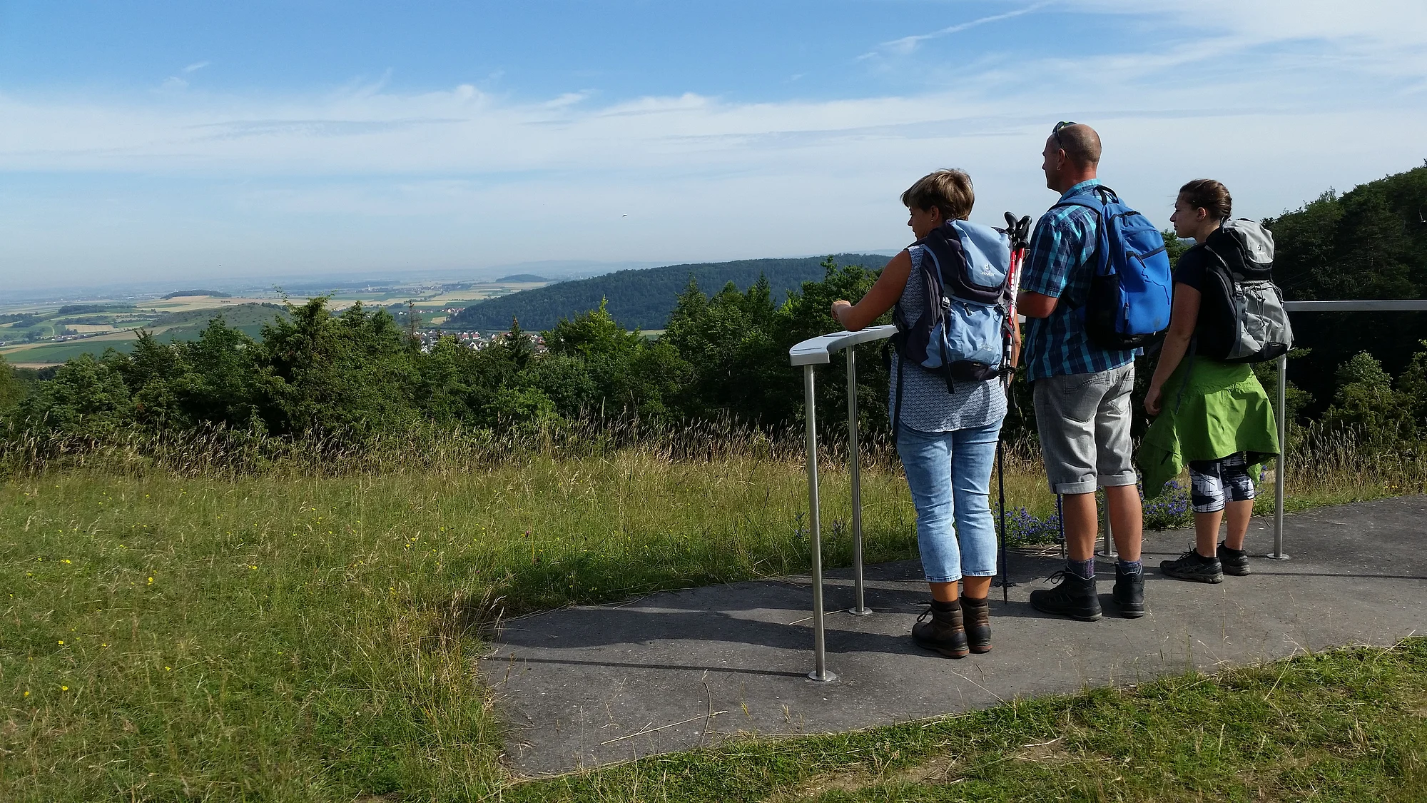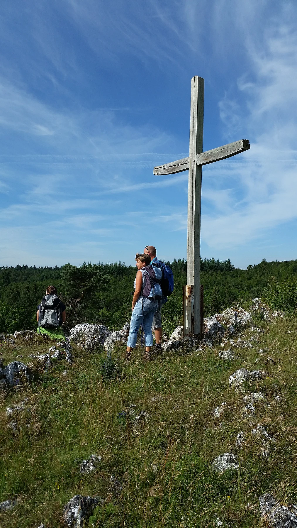 Von dort wandern wir auf einem Grasweg bergan in Richtung Bock. Rechterhand passieren wir den ehemaligen jüdischen Friedhof am Waldrand des Hühnerberges. Von hier führt uns der Weg zur Aussichtsplattform der Station Pluto des Rieskrater Planetenweges, von wo aus wir bei guter Witterung sowohl einen wunderbaren Blick in die Riesebene als auch über das Wörnitztal bis nach Donauwörth haben. Weiter geht es über riestypische Heide hinauf zum und wieder herab vom Gipfelkreuz auf dem Bockberg.