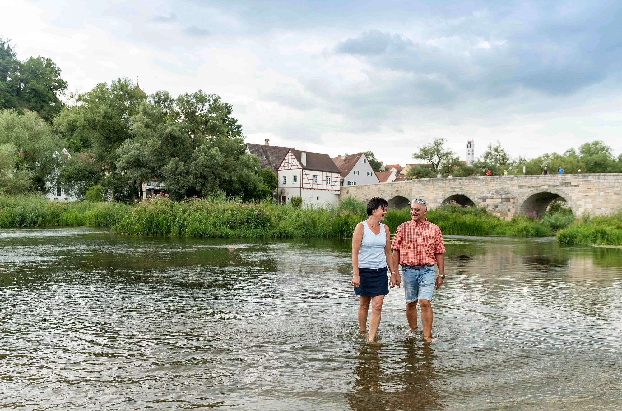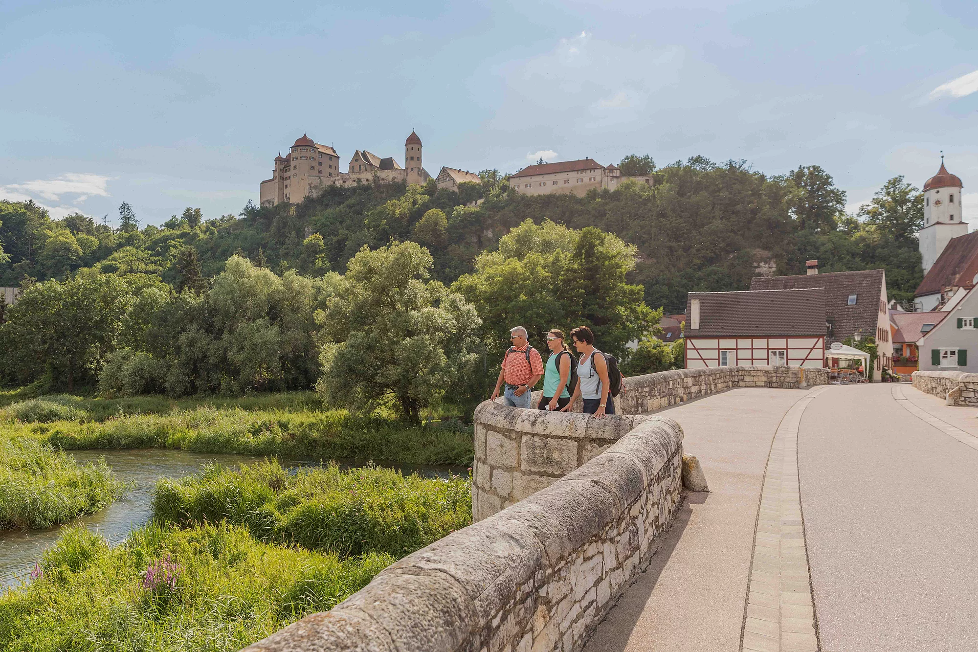 Drei Wanderer stehen auf der steinernen Brücke und blicken auf die Wörnitz. Links oben thront über dem Wald die Harburg.