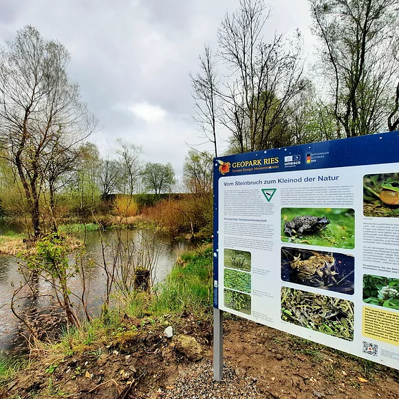Drei Tafeln entlang des kurzen Lehrpfads erläutern Wissenswertes über Geologie, Biologie und Geschichte des Geotops als ehemaligen Suevit-Steinbruch.