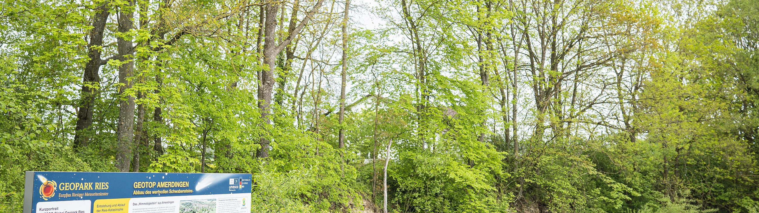 Drei Tafeln entlang des kurzen Lehrpfads erläutern Wissenswertes über Geologie, Biologie und Geschichte des Geotops als ehemaligen Suevit-Steinbruch.