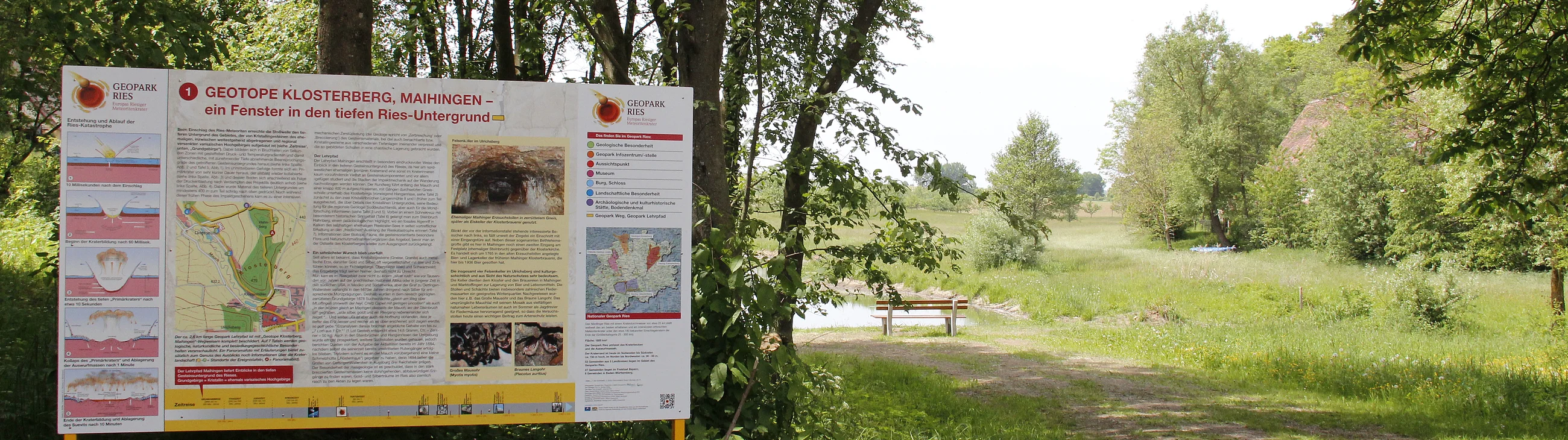 Entlang des Geopark Lehrpfads werden auf 7 Tafeln geologische, naturkundliche und kulturhistorische Besonderheiten veranschaulicht. Beim Genuss des Ausblicks über die Kraterlandschaft vom Hahnberg aus informiert ein Panoramafoto mit Erläuterungen. Die Aufschlüsse in den Geotopen Klosterberg, Maihingen, gewähren Einblicke in den tiefen geologischen Untergrund der Region: Hier, am nordwestlichen Rand des Primärkraters, treten Gesteine aus dem kristallinen Grundgebirge zutage. Der Lehrpfad führt durch das landschaftlich herrliche Mauchtal zu den beiden ehemaligen Kristallin-Steinbrüchen Langenmühle I und II und weiter zum Steinbruch Hahnberg, wo ein fossiles Algenriff des ehemaligen Rieskrater-Sees aufgeschlossen ist.
