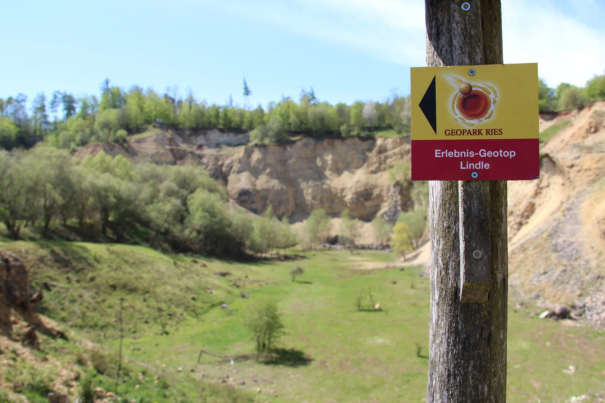 Der Geopark-Lehrpfad durch das Erlebnis-Geotop Lindle offenbart geologische, naturkundliche und besiedlungsgeschichtliche Besonderheiten des Rieses. 13 große und kleine Informationstafeln begegnen den Besuchern auf dem Rundweg. Zudem bieten eine Aussichtsplattform, ein Turm und fünf weitere Aussichtspunkte bei guter Wetterlage eine herrliche Sicht über das Steinbruchgelände, in den Rieskessel und auf die Riesränder. Alternativ können Lehrpfad-Besucher auch eine kürzere Variante mit 1,8 km Länge wählen.